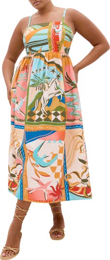 A smocked back panel creates a fitted look for the bodice of this relaxed sundress made of airy cotton.