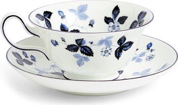 A contemporary take on a classic design, this teacup-and-saucer set made from fine bone china features a quintessential English pattern of hand-drawn vines and strawberries.