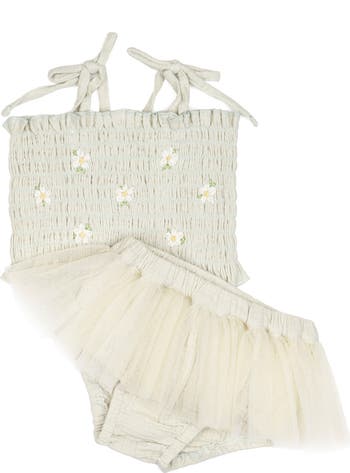 A fresh take on a beloved favorite, the Daisies Tutu Set is designed for sunny days and sweet childhood moments. Crafted from soft, breathable 100% double cotton gauze, this charming two-piece set features an elasticized top adorned with delicate silk ribbon daisies and hand-embroidered accents. Adjustable shoulder tie straps allow for a comfortable, flexible fit, while the matching bloomers are finished with a soft, poofy tulle skirt overlay that adds a playful touch little ones love. Thoughtfully made with care in Peru.