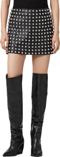 Gleaming dome studs grid the front—the back is left clean so sitting isn't a problem—of this leather miniskirt that's the perfect mix of edgy and glam.