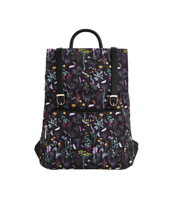 A free spirit, untamed and ethereal, Cathy is the heroine of this A/W collection that depicts the beauty of forests at night. A colourful botanical print set against a deep black backdrop, every inch of the spacious Buckle Backpack is covered with feathers, foxgloves, dragonflies and hedgerow fruits. With a padded compartment for laptops, a zip up front pouch and adjustable straps, it will be your go-to companion for everyday journeys and spontaneous escapes.