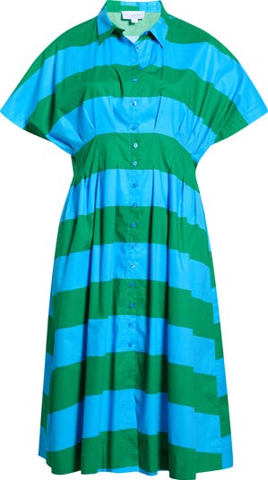 Wide, vertical stripes bring a splash of collor to this shirtdress detailed with pleats that add soft structure to the silhouette.