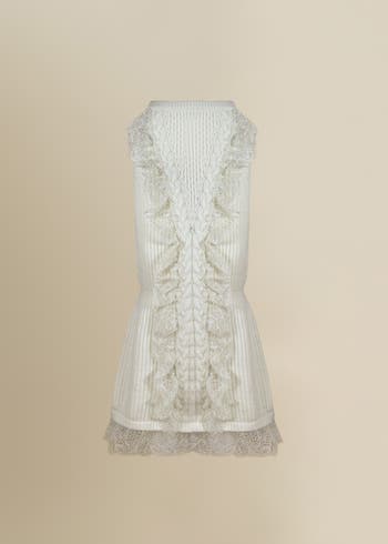 A mid-rise long knit skirt made of a soft, warm wool. Lace adorns the front and the hem.