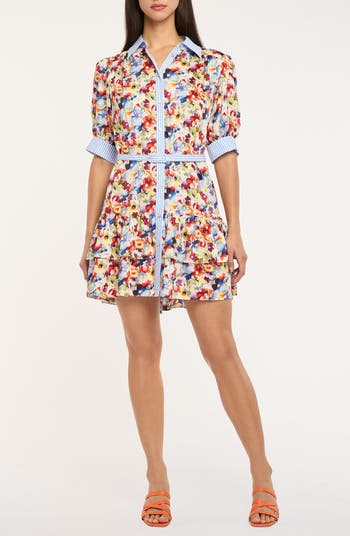 This A-line shirtdress detailed in puff sleeves and a tiered skirt is enveloped in painterly wildflower blooms.