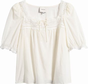 Sheer lace trim brings boho energy to this superbreezy organic-cotton blend top framed by puff sleeves.