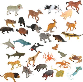 3 years & up. Children will enjoy this large assortment of animals from around the world and some from their very own backyard. From the land and sea, these animals are great for block play, habitat exploration, and building language skills. This set of animals is a great addition to any sand or water table. Use this exciting collection in a lesson about wildlife. Have children take turns picking out their favorite animals and describing them. Includes 32 animals. Animals range from 5" to 6.5".