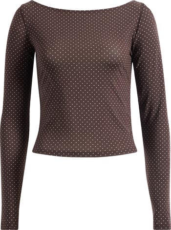 Tiny polka dots add a classic note to this stretchy, fitted top styled with a clean boat neckline and slightly cropped length.