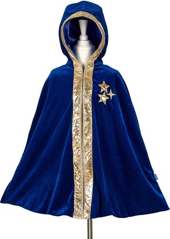 Wilfred - Magician Cape Beautiful Souza wizard cloak in navy velvet with fine gold stars on the left breast. The Souza cape closes on the front with practical velcro and has a soft, sewn-on hood. The cape has a lovely, blue satin inside and a wide gold edge in its opening at the front. The cape is made in a soft and delicious valor quality and is perfect for costume and everyday play.