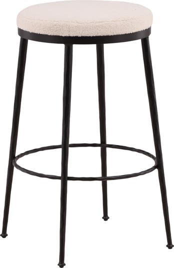The Willa Bar Stool pairs a softly textured ivory bouclé seat with a sleek black iron frame, striking a refined balance between comfort and modern structure. Its minimalist silhouette and circular stretcher detail offer both visual lightness and functional support, making it an effortless addition to kitchen islands or bar settings. Crafted with cotton bouclé upholstery and iron, the piece features slight variations in texture and finish that add to its character.