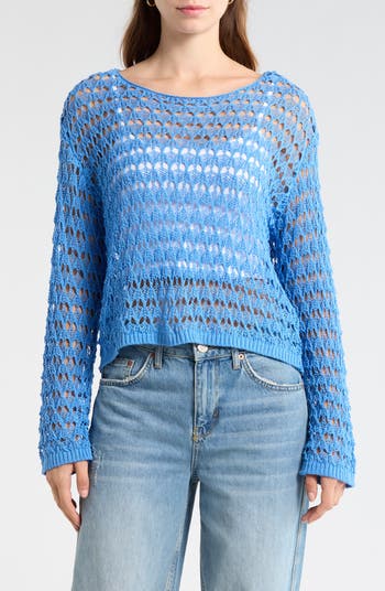 Crochet-inspired open-knit stitches lend a boho vibe to this sheer sweater that's made of a supersoft cotton blend.