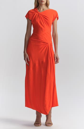 Gathered details at the neckline and hip creates unique draping on this textured, wool-kissed maxi dress cast in a vibrant color.