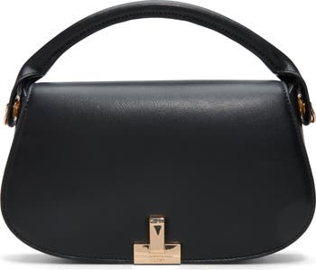 Geometric logo hardware gleams against the smooth faux leather exterior of a structured bag featuring an optional, adjustable crossbody strap for comfortable hands-free wear.