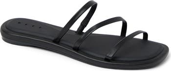 A trio of asymmetric straps saunter over a minimalist slide sandal set on a cushioned footbed with built-in arch support perfect for comfy beachside strolls.