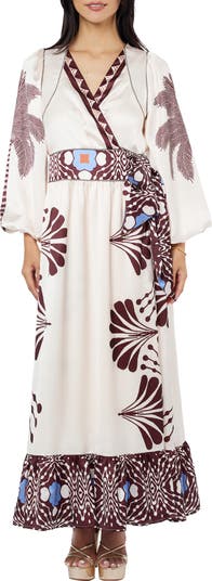 Saunter and sway in this glossy satin maxi patterned in a destination-ready print, framed by billowy sleeves and given waist-defining shape with a drapey side tie.