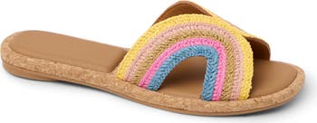 Colorful woven straps make a sophisticated statement on an essential slide sandal grounded by a cushioned footbed.