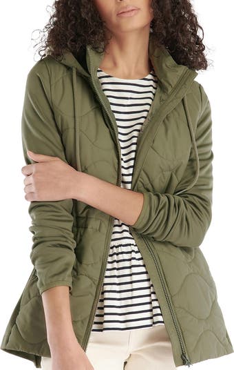 Layer on this lightweight, mixed-media jacket with a drawstring hood and convenient snap pockets. A quilted front, back and hood balance soft knit sleeves and side panels for superior comfort.