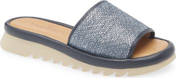 A weave texture distinguishes the supportive strap atop this graceful slide sandal perched on a slim, flexible footbed built for grab-and-go elegance.