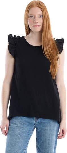 Scoop neck ruffle shoulder tank tee with hi-lo hem An effortless warm-weather essential, this scoop neck tank is crafted in our signature slub jersey for a soft, breathable feel. Ruffle shoulder detailing adds a feminine touch, while the hi-lo hem creates a flattering silhouette with easy movement and modern appeal. 100% Cotton Signature slub jersey fabrication Imported Machine washable Model is wearing a size Small