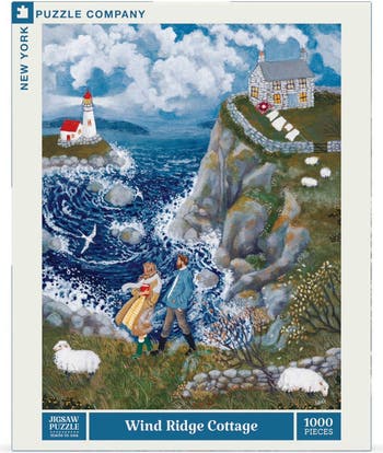 Escape to Serenity with the Wind Ridge Cottage 1000 Piece Jigsaw Puzzle\r\n\r\nImmerse yourself in the beauty of a windswept coastal retreat with the Wind Ridge Cottage 1000 Piece Jigsaw Puzzle by acclaimed artist Lore Pemberton. This breathtaking puzzle captures the charm of a stone cottage perched on a dramatic seaside cliff, with waves crashing below and a picturesque lighthouse standing guard in the distance. The scene radiates warmth and tranquility, offering a serene escape as a couple strolls through rich greenery, surrounded by grazing sheep, wildflowers, and the soft embrace of ocean breezes.\r\n\r\nThe vibrant colors and swirling waves bring the scene to life, while intricate details make this puzzle both a visual delight and a satisfying challenge. As you assemble this peaceful coastal vista, you’ll experience the beauty of Pemberton’s evocative artwork, known for its pastoral charm. The rich natural details and carefully crafted imagery make each piece an opportunity to explore the quiet serenity of this seaside haven.\r\n\r\nCrafted with premium materials, this puzzle features randomly die-cut pieces that ensure no two are alike, offering a truly unique and rewarding puzzling experience. Proudly made in the USA, the high-quality materials enhance the vivid colors and precision fit, allowing the intricate artwork to shine through. Whether you’re a puzzle enthusiast, nature lover, or simply in search of a calming retreat, the Wind Ridge Cottage puzzle offers the perfect way to escape into a world of coastal tranquility.\r\n\r\nBring the serene charm of the seaside into your home and embark on a peaceful journey, one piece at a time. Order now and experience the magic of this coastal haven through the art of puzzle-making.