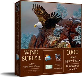 Experience the majesty of nature with the Wind Surfer 1000 Piece Jigsaw Puzzle, featuring the exquisite artwork of Christopher Walden. This captivating puzzle allows you to escape into a serene natural backdrop and marvel at the majestic flight of an eagle. Crafted by SunsOut Puzzles, renowned for their interlocking pieces and high-quality recycled cardboard, each piece of the puzzle is designed for easy handling, ensuring a satisfying assembly process. Committed to eco-conscious craftsmanship, SunsOut uses soy-based inks and recycled board, promising a mosaic of natural elegance with every precisely crafted die cut. Ensuring your puzzle hobby aligns with eco-friendly practices. They take pride in their American-made products and as a woman-owned small business, deliver a celebration of American ingenuity with every puzzle. Shop with peace of mind, SunsOut offers a worry-free guarantee, promising a quick resolution to any issues. Each piece of the Wind Surfer puzzle showcases Christopher Walden's remarkable artistic flair and intricate detailing, making each puzzle-solving experience an immersive journey into the mesmerizing world of nature, art, and discovery.