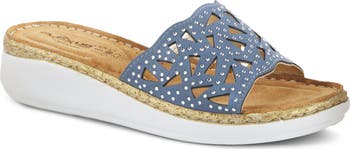 A chunky sole brings everyday comfort and casual glam to this platform slide sandal with geometric cutouts and glistening crystals gracing the vamp.