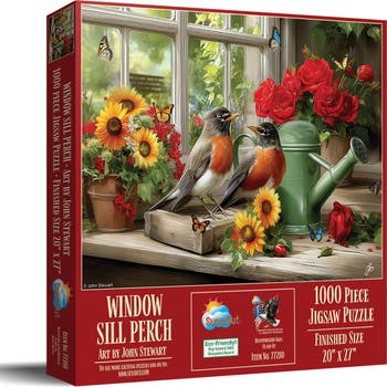 Window Sill Perch 1000 pc Jigsaw Puzzle by SunsOut - 1000 Piece Jigsaw Puzzle - Completed Size: 20" x 27" - Puzzle Artist: John Stewart - Interlocking Pieces and Durable Construction: SunsOut jigsaw puzzles feature interlocking pieces that fit securely, making assembly easier and reducing frustration. -Ages: 15 years and older - Perfect for adults and seniors. SunsOut puzzles ensure high manufacturing standards ensuring their commitment to quality and customer service. - SunsOut puzzles use soy based inks, high quality puzzle board. As this is a jigsaw puzzle: assembly is required and batteries are not required.
