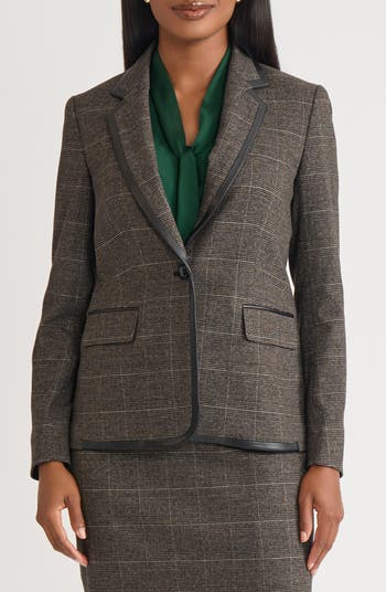 Buttery faux leather traces the polished silhouette of a desk-to-dinner jacket patterned in a classic windowpane plaid.