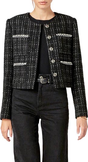 Gleaming buttons underscore the polished appeal of a windowpane-tweed jacket fashioned with bold patch pockets edged in woven chain trim.