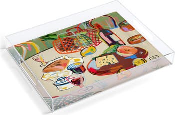 A modern accent for any bath counter or dresser top, this rectangular tray is crafted with artwork on the bottom panel, carrying handles and protective feet.