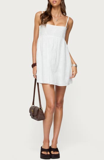 Tonal floral embroidery twines its way across this cotton minidress cut in a charming babydoll silhouette.