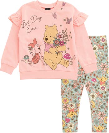 Your Disney fan is ready for a day of adventure in this stylish and comfy Disney outfit! This cute and cozy long sleeve sweatshirt and leggings set features vibrant and colorful artwork of favorite classic Disney characters that your kid will love to wear! Choose from cool designs of Winnie the Pooh and Piglet with a floral print, Stitch from Lilo and Stitch with heart artwork, Princess Ariel from The Little Mermaid with an "under the sea" flower design, Disney Doorables with rainbow stripes, Tinkerbell from Peter Pan with colorful paint splatters, and Minnie Mouse with polka dots and hearts. Made of a soft material that keeps your child comfortable, this fashionable Disney pullover sweatshirt and pants set is the perfect outfit for a fun day of play!
