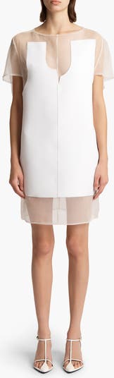 Catherine Holstein trades the sleekness of recent seasons for soft romanticism, teaming texture and shape to attention-getting effect in this cocoon-shape minidress fashioned from smooth double-face crepe and transparent panels of ethereal organza.
