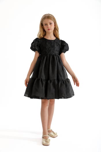 The Winona floral teacup dress featuring satin material, large shoulder puff teacup sleeves with floral embroidery on the bodice. Large and lightweight layered tulle skirt and big bow in the back to complete the piece. The perfect dress for any special occasion!