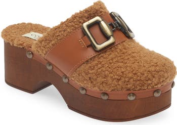 Vintage attitude is the name of the game with this studded faux-shearling clog complete with a leather strap and wood-grain platform sole.