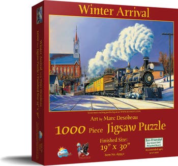 Step into a magical winter landscape with the "Winter Arrival 1000 pc Jigsaw Puzzle" and experience the joy of the season with every piece placed. The puzzle, illustrated by renowned artist Marc Desobeau, perfectly captures a snow-kissed community, transforming it into a pastime and offering an adventure in the form of a 19" x 30" testament to your patience and artistry. SunsOut Puzzles enhances your pleasure by crafting interlocking pieces from high-quality recycled cardboard that snugly fit together, offering a seamless puzzle experience and minimizing frustration. Revel in building with eco-friendly materials including soy-based inks, and feel the satisfaction of supporting a woman-owned small business based in the USA that's dedicated to sustainable manufacturing practices and robust puzzle construction. Every SunsOut puzzle box doubles as an invitation for an unforgettable journey as it transports your imagination to a charming train station painted in vivid colors amidst winter’s embrace. Embrace the challenge and the beauty, propelled by the assurance that comes with SunsOut's commitment to customer satisfaction. Trust in the quality guaranteed with each purchase, and let your passion for puzzle-solving be fulfilled. Experience the pleasurable challenge and the allure of timeless trains through Marc Desobeau's artwork and discover the joy of winter with every piece.