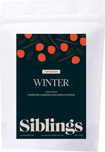 Fragrance story: Winter smells like mom's homemade stovetop potpourri citrus and spice simmering into the air. It's cozy afternoons by the fire, the comfort of family close by and a touch of nostalgia wrapped in every flicker. Siblings's seasonal edition reimagines that timeless blend of citrus and spice into a modern, comforting scent for the holidays.