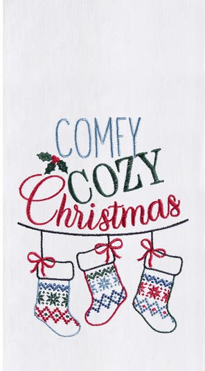 Winter "Comfy Cozy Christmas" Sentiment Featuring Hanging Stockings Cotton Flour Sack Kitchen Dish Towel 27L x 18W in.
