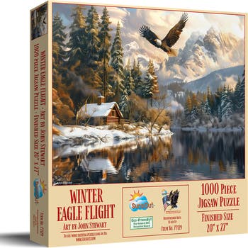Discover the awe-inspiring tranquility of the "Winter Eagle Flight" 1000 piece jigsaw puzzle for adults featuring a serene winter landscape with a majestic eagle soaring over a snow-covered forest and cabin, painted by the distinguished artist John Stewart. This is not merely an image, but an exploration into Americana and nature's beauty, delivering an opportunity to escape into an environment of wonder. Manufactured by the acclaimed SunsOut Puzzles in the USA, renowned for excellent craftsmanship and attention to detail, each chunk of this puzzle interlocks tightly, constructed from high-quality recycled cardboard, printed with eco-friendly soy-based inks. With its commitment to sustainability and quality, SunsOut ensures a rewarding puzzle experience with the minimum of frustration. As a small and women-owned business, SunsOut is dedicated to customer satisfaction, offering a worry-free guarantee for missing or damaged pieces, in addition to environmentally responsible practices. The "Winter Eagle Flight" puzzle, with its splendid colors and exquisite detail, is a perfect gift for nature enthusiasts and puzzle lovers, providing hours of entertainment and fulfillment. Not only does it challenge your problem-solving skills, but it also serves as a serene escape from daily stresses, offering a meditative experience. Each piece assembled brings you closer to the complete, stunning illustration of winter wilderness, an ideal piece of art to frame and exhibit in your own home. This puzzle thus serves as a gateway to artistic exploration and a celebration of nature's untouched beauty.