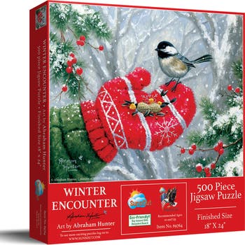 Dive into a serene winter landscape with the Winter Encounter 300 piece jigsaw puzzle for adults by SunsOut. Featuring the captivating artistry of Abraham Hunter, this beautifully crafted puzzle measures a completed size of 18" x 24", revealing stunning winter wonderland imagery that invites tranquility with every piece. Each piece ushers you into a delightful world where nature and artistry effortlessly merge, providing a serene escape from the everyday hustle. Hunter's artistry ingeniously captures the quiet beauty of a winter scene, presenting enchanting animals and charming holiday elements in vibrant colors. Proudly made in the USA, SunsOut jigsaw puzzles meet high-quality standards, crafted from durable, recycled cardboard and using soy-based inks, ensuring each puzzle offers a seamless, eco-friendly assembly experience. As a woman-owned small business, SunsOut takes pride in delivering puzzles that support local craftsmanship and small business excellence, making it more than just a purchase, but a venture into community contribution. Whether you're an eager puzzler or looking for the perfect holiday gift, the Winter Encounter jigsaw puzzle provides hours of relaxation and entertainment while also being a meaningful way to bond with loved ones, sharing stories and creating cherished memories with every piece assembled.