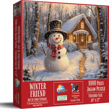Step into a winter wonderland with the "Winter Friend" 1000 Piece Jigsaw Puzzle by John Stewart, a heartwarming piece of art that infuses your home with festive cheer and Americana charm. Proudly manufactured in the USA by SunsOut Puzzles, this puzzle boasts superior craftsmanship and quality, made using durable, high-quality recycled cardboard and interlocking pieces for a smooth, frustration-free assembly. The vibrant colors of the eco-friendly, soy-based inks add to the beauty of the artwork, delivering a stunning addition to your puzzle collection. By purchasing from SunsOut Puzzles, a woman-owned business, you're supporting a firm committed to quality, innovation, and sustainable practices that are gentle on our planet, ensuring a guilt-free, environmentally-friendly puzzle experience. Your satisfaction is this venture's priority, so any missing or damaged pieces will be promptly resolved by their dedicated customer service team, reflecting their commitment to high manufacturing standards and the pleasure you derive from their beautiful puzzles.