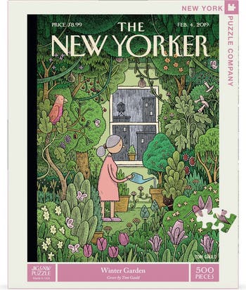 Step into a serene and cozy world with Winter Garden, a 500 piece jigsaw puzzle featuring the captivating 2019 New Yorker magazine cover art by Tom Gauld. This enchanting scene showcases a woman tending to her indoor oasis, surrounded by a rich array of vibrant greenery as rain gently pours outside the windows. The contrast between the peaceful indoor garden and the moody weather creates a calming and immersive puzzle experience. With intricate details and soft, soothing colors, Winter Garden invites puzzle lovers and art enthusiasts alike to escape into a tranquil, green-filled sanctuary. Perfect for cozy afternoons or relaxing evenings, this puzzle celebrates the beauty of nature indoors and the peaceful moments of solitude.