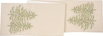 - Showcasing elegant evergreen trees inspired by winter gardens, this table runner blends traditional holiday charm with timeless style. Its intricate pattern and soft neutral tones create a festive yet refined look for any Christmas celebration.