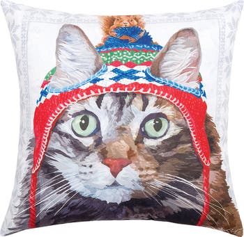 Winter Hat Cat Indoor/Outdoor Christmas Holiday Throw Pillow, 18" x 18"
