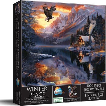Immerse in the tranquility of a serene winter landscape with the "Winter Peace" 1000 piece jigsaw puzzle, beautifully crafted by renowned artist John Stewart, and presented by SunsOut Puzzles. This perfection of a masterpiece, featuring a cozy cabin by a glistening lake with majestic birds soaring above, draws you into the peaceful embrace of nature. As you navigate the puzzle's intricacies, you'll uncover not only the allure of the winter season but also a moment of calm and creativity. Crafted in the USA, the "Winter Peace" puzzle, showcasing vibrant and exquisite details, is made from sustainable, eco-friendly materials including high-quality recycled board and soy-based inks. Each puzzle piece is perfectly designed for durability and interlocks flawlessly, offering a smooth and frustration-free puzzling experience, backed by a worry-free guarantee and excellent customer service. Measuring a generous 23" x 28" when completed, it serves as a captivating gift for adults and fits perfectly in any puzzle lover's collection. Not only will you marvel at Johns Stewart's artwork, but also appreciate SunsOut Puzzles' dedication to nurturing and preserving the environment. By choosing SunsOut Puzzles, you're supporting a woman-owned small business dedicated to creating artistically appealing puzzles for enthusiasts worldwide, thus contributing to an enterprise that signifies creativity, empowerment, and environmental sustainability.