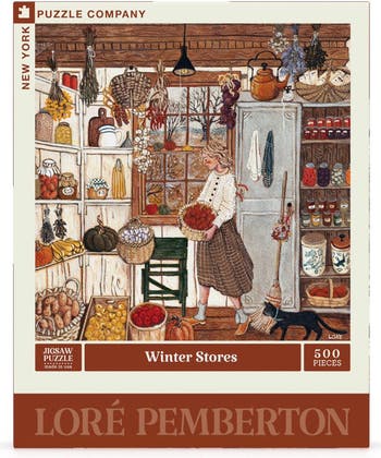 "Winter Stores" by Lore Pemberton captures the charm of a cozy winter scene, where a warm-hearted shopkeeper lovingly stocks the shelves with the season's harvest, inviting neighbors to gather for provisions and holiday cheer. A customer favorite, this 500-piece puzzle makes a wonderful gift for puzzle lovers and anyone who appreciates the simple joys of winter.