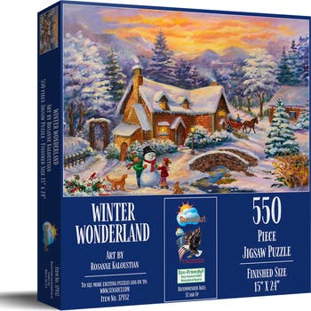 Experience the magic of a serene holiday escape with the Winter Wonderland 550 piece jigsaw puzzle for adults by SunsOut Puzzles. Created with a captivating picturesque winter setting, this puzzle is crafted from high-quality recycled cardboard and features beautiful artwork by Rosanne Kaloustian. Ideal for rediscovering the joy of winter, it measures 15" x 24" when completed. The interlocking pieces are durable and designed to reduce frustration during assembly. Proudly made in the USA, it symbolizes SunsOut's commitment to quality, durability and excellent customer service. Emphasizing eco-friendly manufacturing, the pieces are created with soy-based inks and recycled-board materials. The company prides itself on being a woman-owned small business dedicated to sustainability, quality, and empowerment. The puzzle box is designed with a full-color display showcasing the stunning winter landscape. Perfect as a gift, this puzzle can be a solo retreat or a family activity, making it a cherished winter tradition. Experience the satisfaction of supporting a meaningful cause with a purchase that combines beauty, quality, and heart.