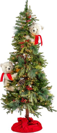 Warm LEDs sparkle through layered boughs while plush bears turn this small pre-lit tree into a whimsical vignette that plays beautifully with the rich red tree skirt. Set it alongside framed photos or candlelight for an instant scene that feels nostalgic yet fresh.