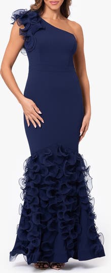 Wired ruffles amp up the festive feel of a form-fitting gown designed to showcase one shoulder.