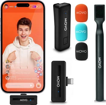 Capture professional quality audio directly to your iPhone with an ultracompact wireless microphone system featuring an all-in-one transmitter/lavalier microphone and receiver with an MFi-certified iPhone lightning connection. A handheld microphone mount makes this kit ideal for interviews, reporting, vlogging, content creation and more. At just two inches long and weighing 0.3 oz, the Wireless Mini transmitter is featherlight and can be clipped on easily as a wireless lapel microphone. It features studio-grade circuitry, and a selectable "Noise Cancellation" setting, ensuring that your audio is clear and noise-free. With a frequency range of 20Hz to 16Khz and a high signal-to-noise ratio, your audio signal will be clear and broadcast-ready. The power button on the transmitter also acts as a one-touch "mute" button when short-pressed. The receiver features an MFi-certified Apple Lightning connector so you can plug in and be ready to record 16-bit audio instantly to your iPhone. The "pass-through" USB-C charging port allows you to charge your iPhone while the receiver is plugged in. The transmitter and receiver are auto-pairing, so you'll be ready to connect and record in no time. With a 10-hour battery life, you'll never worry about recharging during an all-day shoot or recording session. The Wireless Mini system comes with all the accessories you'll need, including a USB-C to USB-A charging cable, a foam windscreen for the microphone, and a neoprene carrying case. The WMX-HM microphone mount is perfect for interviews, reporting, vlogging and more. It comes with an additional professional grade windscreen that fits over the whole transmitter, allowing you to protect your audio from distortion and noise in any conditions. All Movo products are backed by a 1-year warranty and friendly, US-based customer service.