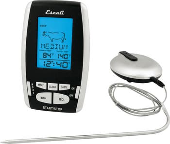 The Escali DHRW2 Wireless Remote Thermometer and Timer combines two crucial kitchen tools into one portable multifunctional unit. Set a custom temperature alert or choose from a library of suggested internal cooking temperatures for beef, lamb, veal, hamburger, pork, turkey, chicken and fish. The wireless remote display and timer will give you the confidence to multitasking with live access to temperature measurements and alerts.